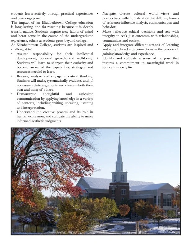 This was a project where I put together a layout for an article for Elizabethtown College. The writing and images are not my own, I was given the photos and words and placed them in. I learned that less is more but there should still be visually appealing elements to designs that may seem more professional and simple.